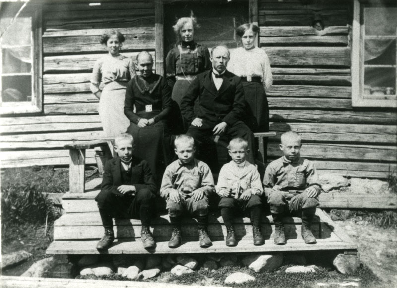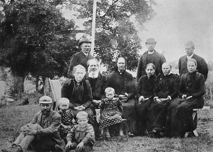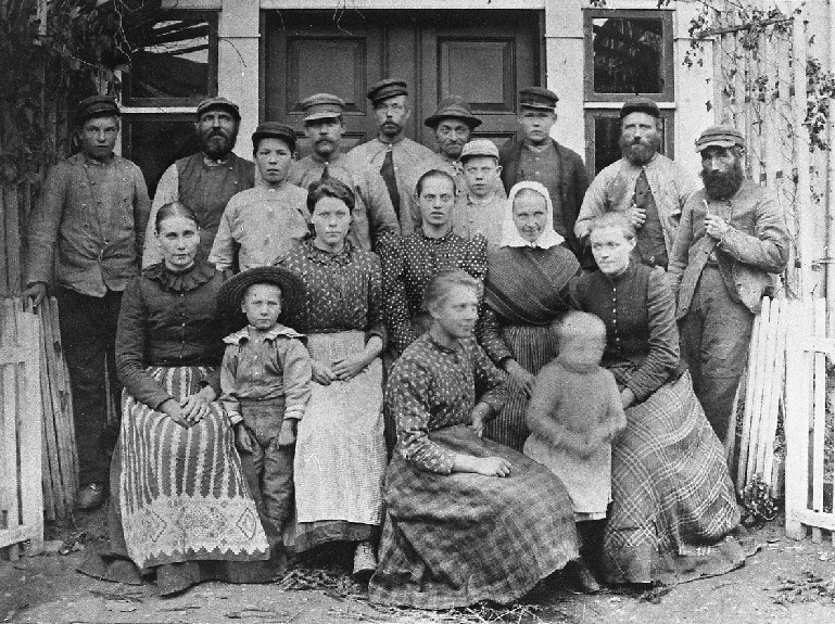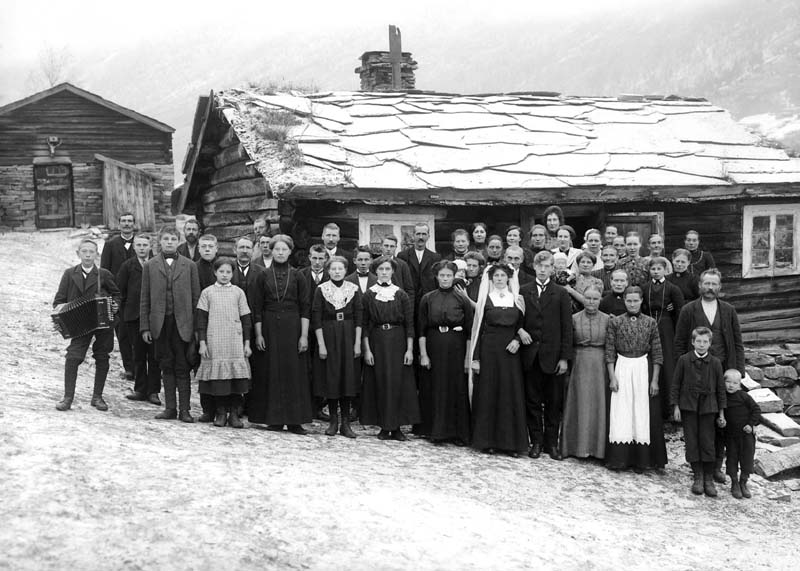 Unge husmannsfolk gifter seg, 1894 – Sittende foran: Haaken Skramstad. Barn: Johanne, Nils og Karen Skramstad. Sittende: Anna Skramstad, Ole og Marte Maulbørsbakken, Marte Petersborg, bruden Malla, N.N. (søster til Even Myrsveen). Stående: Julius Petersborg, Nils Kraby og brudgommen Even Myrsveen. Foto tatt på Skramstad 1894. – Fotograf: Ludvig Christensen. Foto: Mjøsmuseet / R 78/003/14.