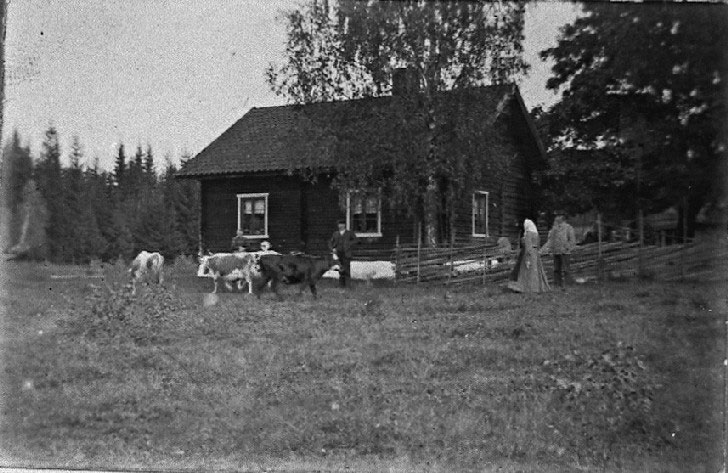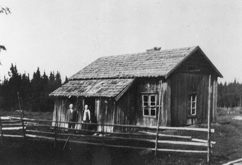 Plassen Granli under Horgen. Granli ligger nordøst for Nordtangen, Gran kommune. Husets høyre del var tidligere badstu på vestre Framstad. Tilbygget er i reisverk. Hans Jacobsen Granli (1857-1934) som bygget Granli og konen han Marte (1856-1942) flyttet inn på plassen i 1894. Hans eide huset, men ikke jorda. Han arbeidet to dager i året på Horgen søndre for leie av jorda. Bildet er fra 1909. – Fotograf: Lars Bleken, Foto: Randsfjordmuseene AS