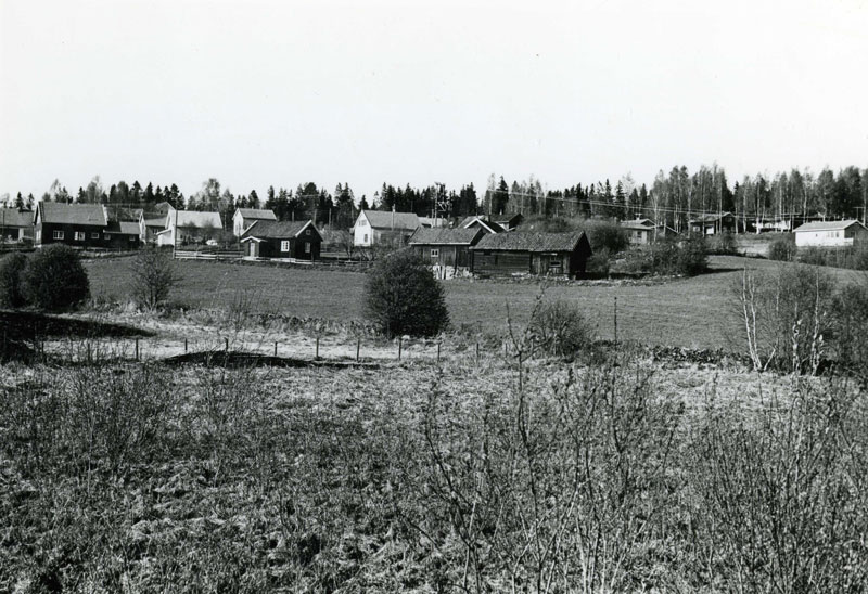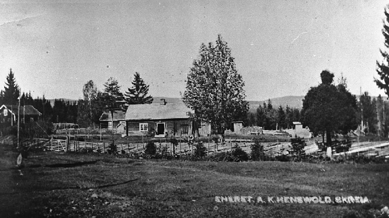 Elvsveen og Sveum, Østre Toten, 1922 – To husmannsplasser på Skreia. Foran på bildet ser vi husmannsbruket Elvsveen, og bak husmannsbruket Sveum. Bakerst til venstre er huset til mølleren i Kvernum, Johan Eneberg. Bildet er tatt i 1922. – Fotograf: A. K. Hensvold. Foto: Mjøsmuseet, R 80/013/09.