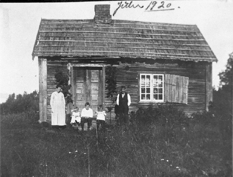 Hågåstua, Vestre Toten – Plass under Hjelpestein øvre. Bildet er tatt i 1920, og viser Klara, Else, Marry, Arman og Alek Børresen, som leide dette ei tid. – Fotograf: Ukjent. Foto: Mjøsmuseet / R 98/008/08.