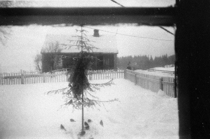 Hestsveen, Østre Toten – Hestsveen var to plasser under Balke vestre. Bildet viser stua i Hestsveen søndre, sett fra døråpningen i Hestsveen nordre, fotografert i jula 1940. De to husmannsstuene var helt like, og begge var malt okergule. Plassene var også like store med ca. 12 mål jord og 2 kuer, 1 foringsdyr, gris og noen høner. – Fotograf: Anna Berg. Foto: Mjøsmuseet / R 79/040/06.