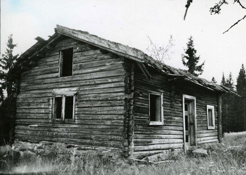 Dagfinrud, Vestre Toten, 1958 – Bildet viser våningshuset på husmannsplassen Dagfinrud under Alm, fotografert i 1958. Huset var en gang dobbelt så langt, og det bodde to husmenn her i hver sin ende (jfr. folketellinga 1865). Halvparten av huset ble tatt ned og satt opp igjen på Almsbakken, som også var plass under Alm. Da bildet ble tatt hadde huset stått tomt lenge, og uthusa var borte. Jorda som hørte plassen til ble brukt av Alm. – Fotograf: Sigmund Kildal. Foto: Mjøsmuseet / R 78/046/08.