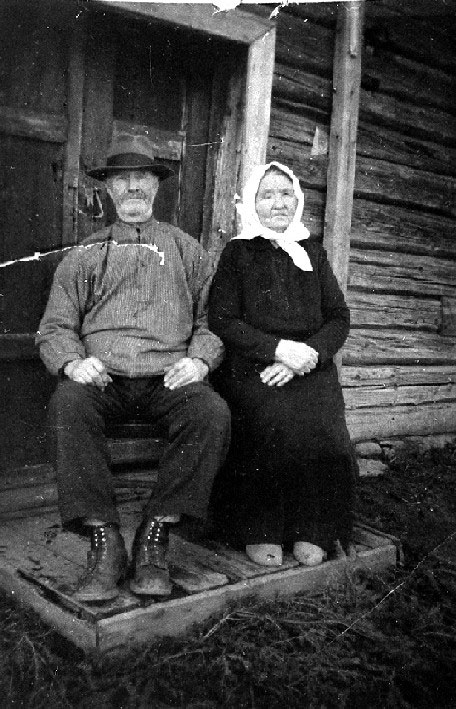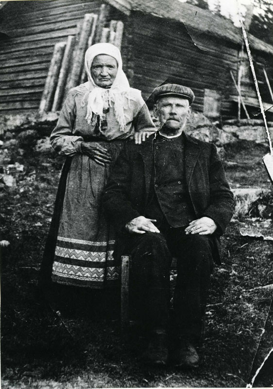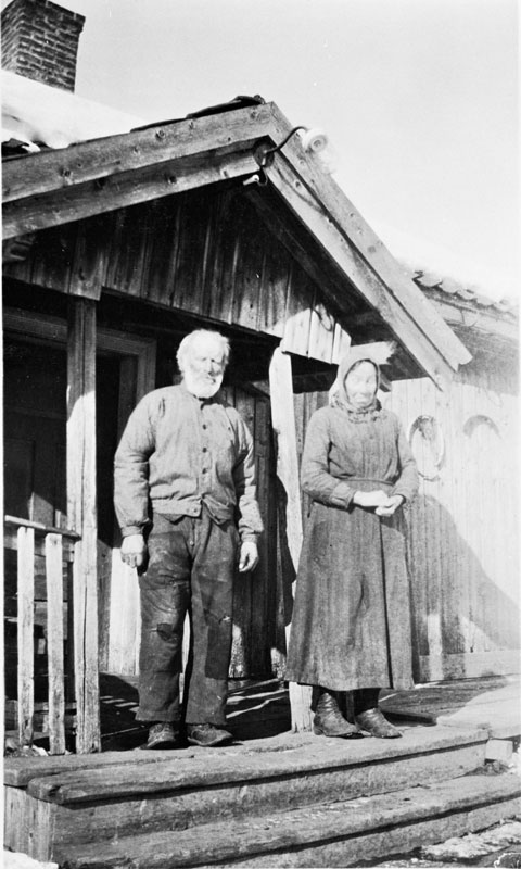 Husmannsfolk i Korsvollhagen, 1925 – Kristian Mathiassen Korsvollhagen (f. 1865) og kona Inge Maria Kristiansdatter (f. 1861), fotografert foran stua på plassen Korsvollhagen under Aslakrud i Kolbu ca. 1925. Inge Maria var da blitt blind. På husmannsplassen hadde de ei ku, en gris og noen høner, og ca. fem mål jord. – Fotograf: Ukjent. Foto: Mjøsmuseet / R 79/025/06.