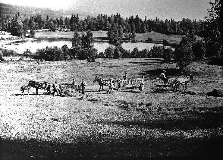 Høyonn, Under Slåttonna var det stort behov for hjelp på gårdene. Her er det høyonn på Bleken, Gran kommune. Bildet er fra rundt 1910 – Fotograf: Lars Bleken, Foto: Randsfjordmuseene AS