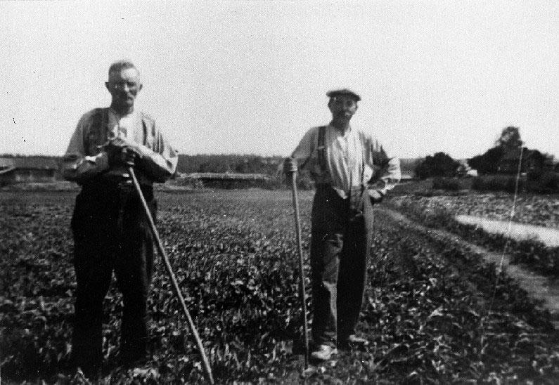 Husmenn på Rogneby, Østre Toten – 1. Peder Anton Lauritsen Gaarderhagen, f. 9. mars 1875, d. 24. oktober 1961. 2. Bernt Martinsen Møllerhaugen, f. 11. april 1882, d. 27. desember 1952. Bildet er tatt før 1950 på Rogneby i Østre Toten. – Fotograf: Ukjent. Foto: Mjøsmuseet / R 90/031/06.