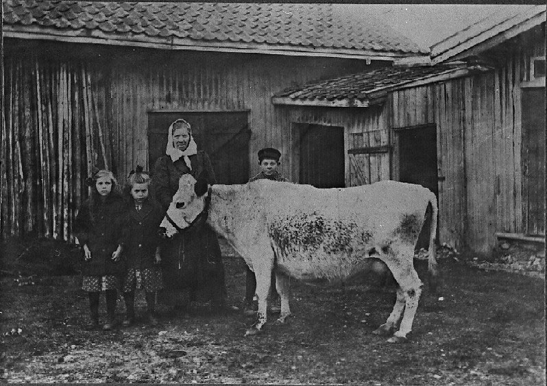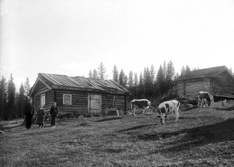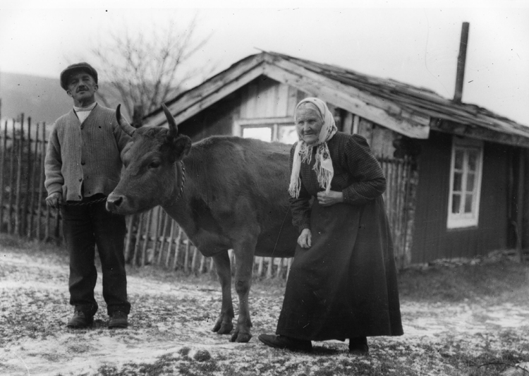 Kua var viktig for husmannsfolka – Pauline Johannesdotter Elstadkleiven f. 1847, fra Ringebu med sønnen Jon og kua, utenfor huset på plassen Høgkleiva ca. 1925. – (Foto: Jørgen N. Elstad, Maihaugen – SS-JNE-5692)