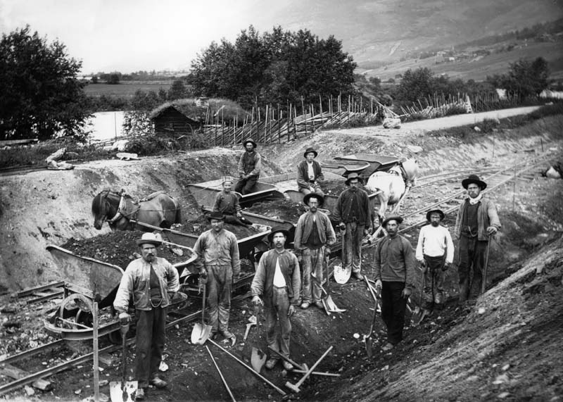 Jernbanen gjennom Gudbrandsdalen ble bygd i midten av 1890-åra, og skapte mange nye arbeidsplasser for husmenn. Bildet viser H. H. Kirketeigens arbeidslag ved Kvam i Gudbrandsdalen. – (Foto: Hans H. Lie, Maihaugen – SS-HHL-03048)