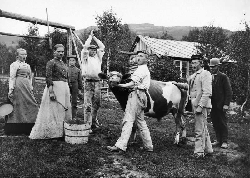 Storfeet hadde stor betydning både på grunn av melka og kjøttet. Her gjøres det klart for slakting – (Foto: Hans H. Lie, Maihaugen – SS-HHL-03195)