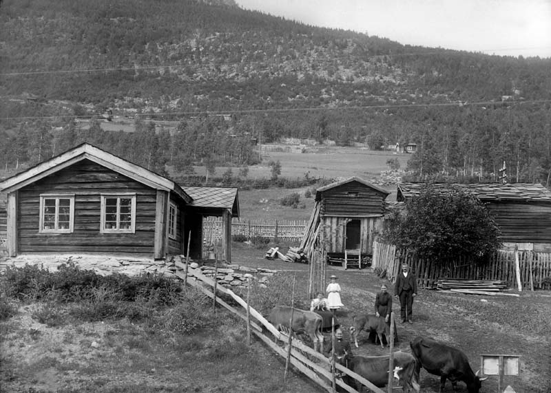 Folk og dyr på plassen Moen i Kvam fotografert i 1913. – (Foto: Hans H. Lie, Maihaugen – SS-HHL-16184)