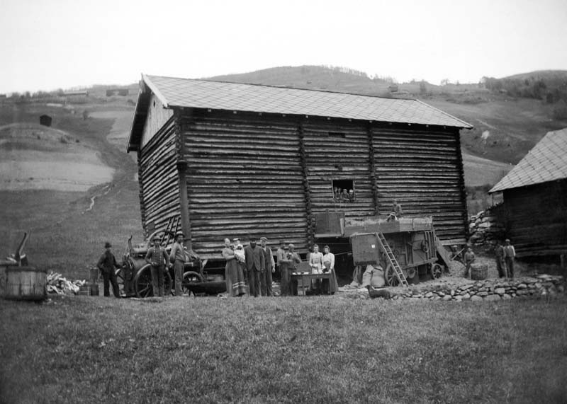 Tresking med treskeverk som blir drevet av lokomobil. Brandvol i Fron 1901 – (Foto: Hans H. Lie, Maihaugen – SS-HHL-C-00003)