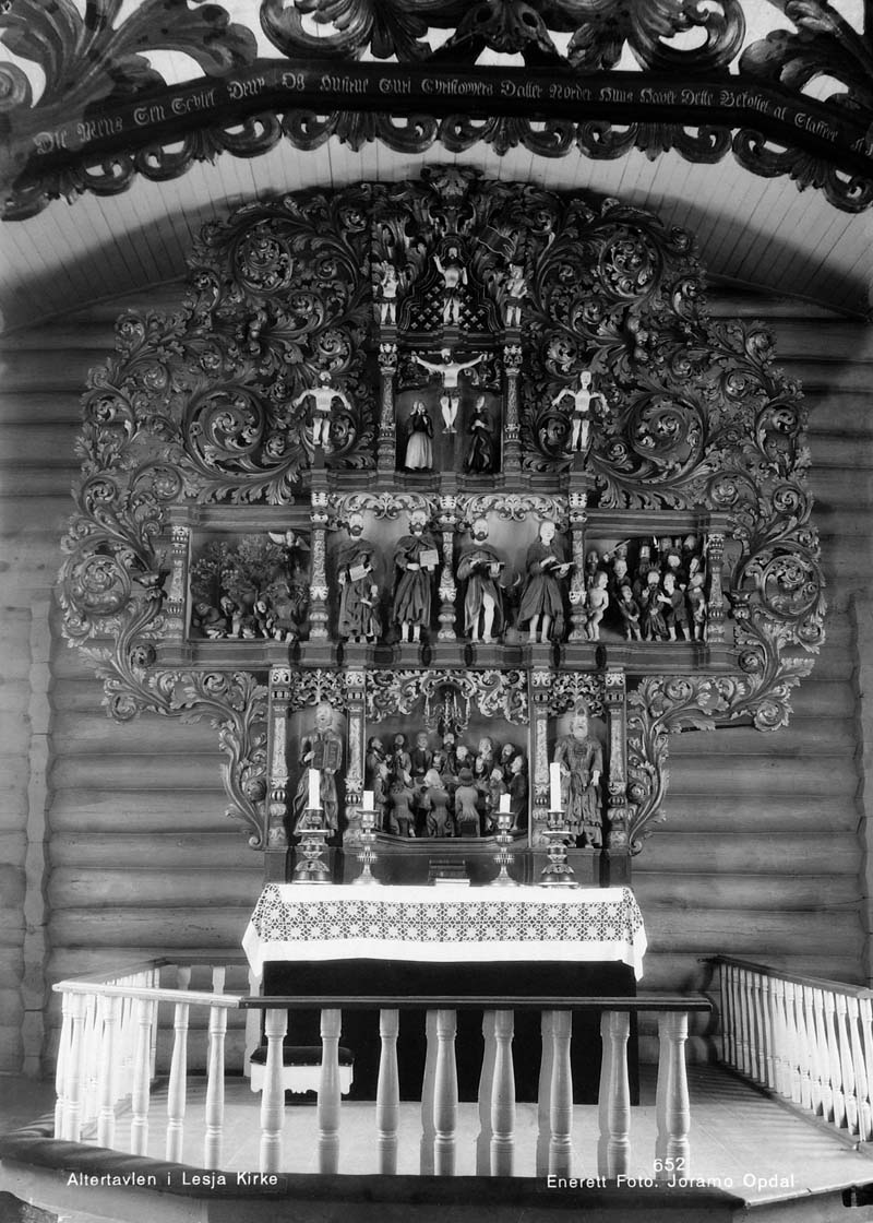 Altertavla Lesja kyrkje. Mange husmenn var dyktige håndverkere. Altertavla er skåret av Jakup Bersveinsson Klukstad, trolig født på husmannsplassen Rødningen under Garmo i Lom. Jakup klarte å komme seg vekk fra husmannskåra og bygslet gården Klukstad på Lesja. – (Foto: Hans H. Lie, Maihaugen – SS-HJL-0266)