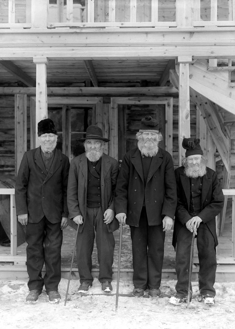 Fire brødre fra Skjåk fotografert rundt 1905. Bønder og husmenn hadde ofte samme opphav, og innenfor samme barneflokken kunne noen bli sjøleiende bønder og andre husmenn. Av disse fire brødrene var det både et par gårdbrukere og en husmann. Fra venstre: Peder Aurstad f. 1832, Ola Bakke f. 1827, Ola Rudsar f. 1829 og Erik Nørstenesstuen f. 1824. – (Foto: Kristian Stakston, Maihaugen – SS-KS-A-0767)